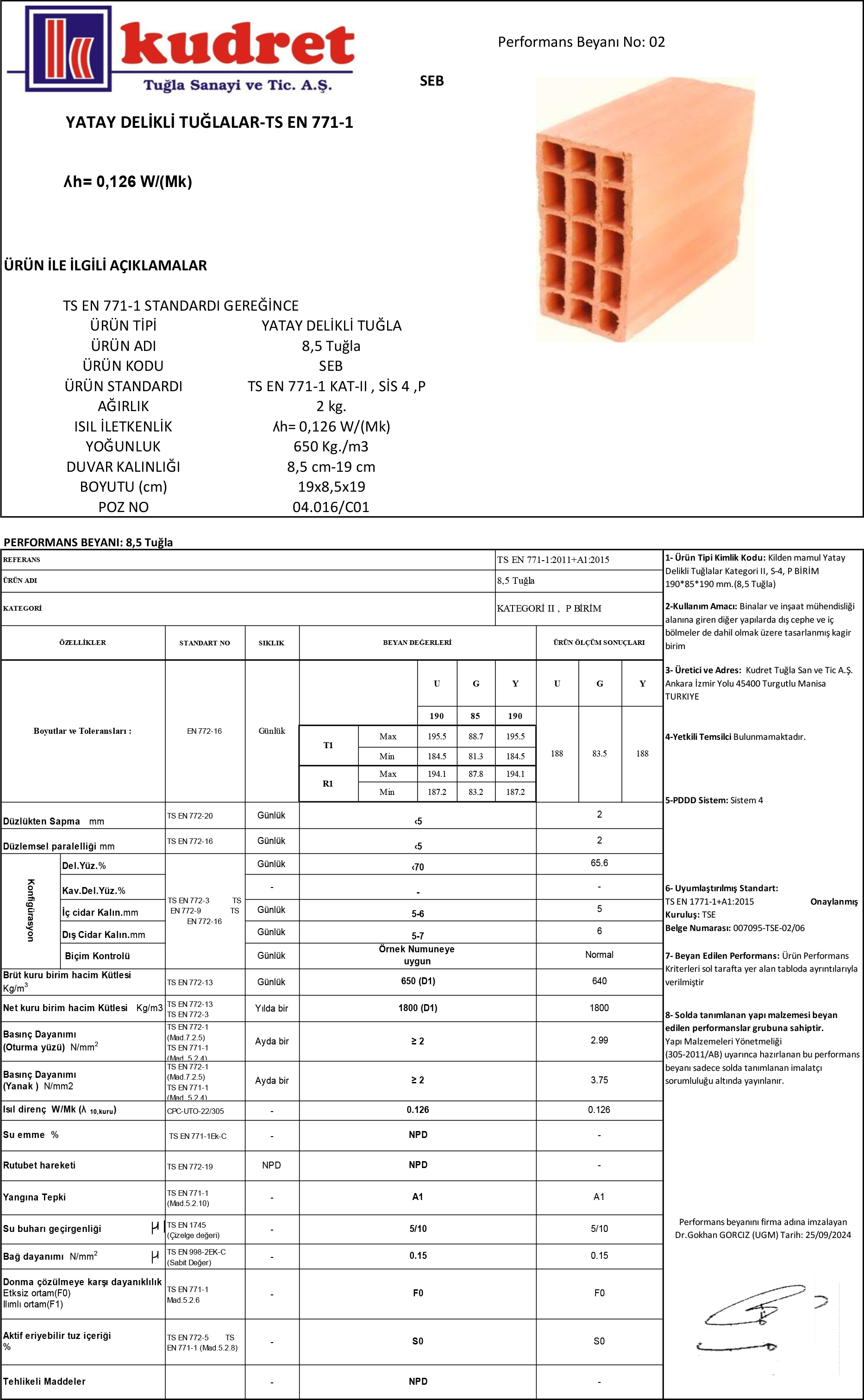 • Ürün Tipi : Yatay Delikli Tuğla • Ürün Adı : 8,5 Tuğla • Ürün Kodu : SEB • Ürün Standardı : TS EN 771-1 KAT-II ,P, SİS 4 • Ağırlık : 2 Kg • Isı İletkenlik : ʎh= 0,126 W/(Mk) • Yoğunluk : 650 Kg/m3 • Duvar Kalınlığı : 8,5 cm-19 cm • Boyutu (cm) : 19x8,5x19