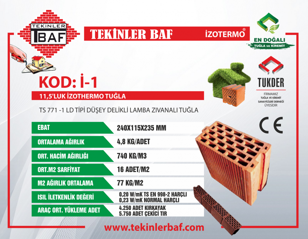 TS EN 771-1 LD Tipi Düşey Delikli Lamba Zıvanalı Tuğla Ürün Kod: İ-1 • Ebatlar (Uzunluk x Genişlik x Yükseklik) : 240 mm x 115 mm x 235 mm • Ağırlık : 4,8 kilogram / Adet • Ortalama Hacim Ağırlığı : 740 kg/m³ • Sarfiyat : 16 adet/metrekare • Ortalama m² Ağırlık : 77 kg/m² • Isıl İletkenlik : ʎh= 0,20 W/(Mk) TS EN 998-2 Harçlı - 0,23 W/(Mk) Normal Harçlı • Araç Ortalama Yükleme Adet : 4250 Adet Kırkayak, 5750 Adet Çekici Tır