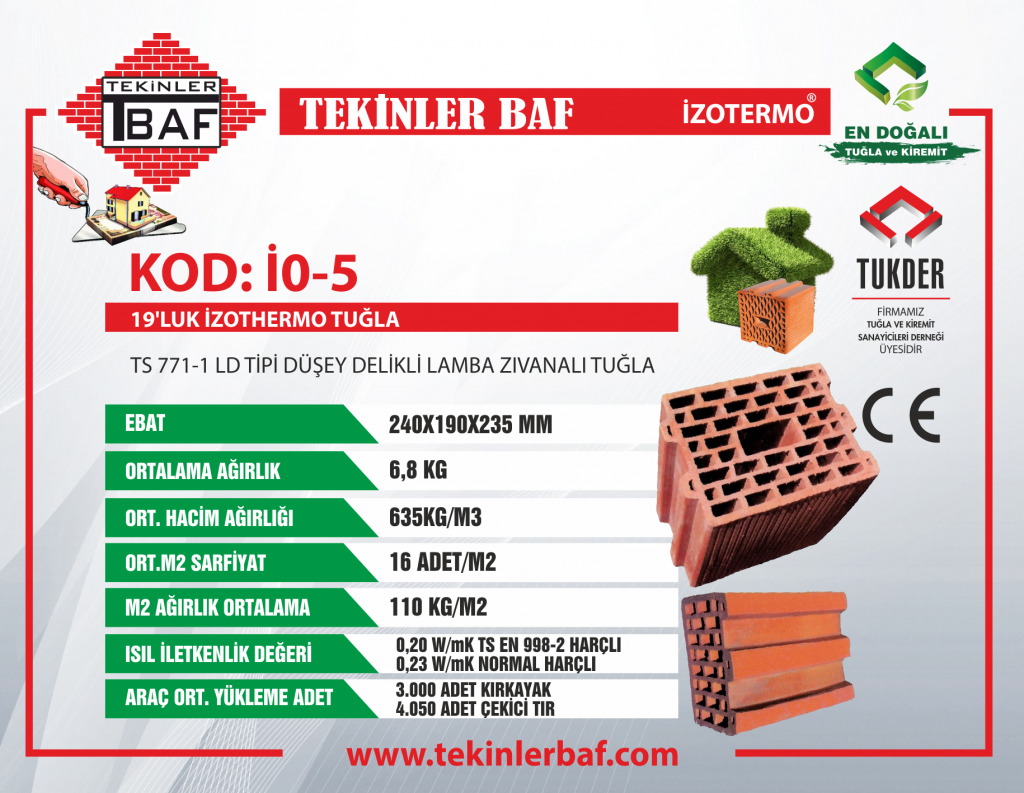 TS EN 771-1 LD Tipi Düşey Delikli Lamba Zıvanalı Tuğla Ürün Kod: İ0-5 • Ebatlar (Uzunluk x Genişlik x Yükseklik) : 240 mm x 190 mm x 235 mm • Ağırlık : 6,8 kilogram / Adet • Ortalama Hacim Ağırlığı : 635 kg/m³ • Sarfiyat : 16 adet/metrekare • Ortalama m² Ağırlık : 110 kg/m² • Isıl İletkenlik : ʎh= 0,20 W/(Mk) TS EN 998-2 Harçlı - 0,23 W/(Mk) Normal Harçlı • Araç Ortalama Yükleme Adet : 3000 Adet Kırkayak, 4050 Adet Çekici Tır