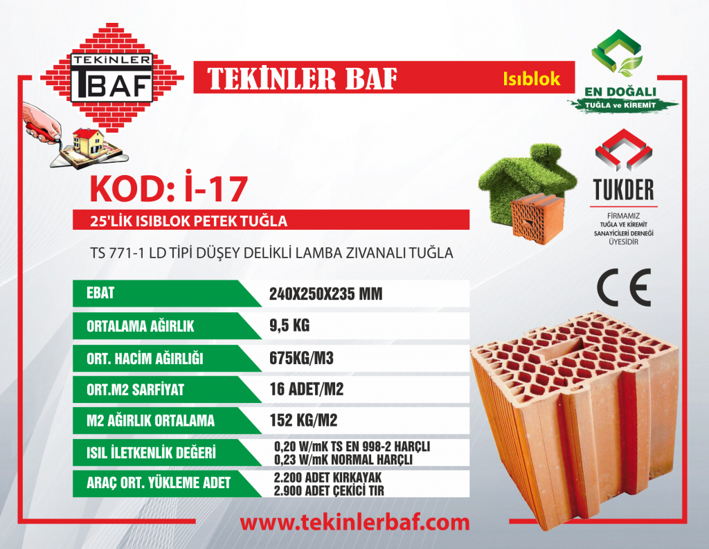TS EN 771-1 LD Tipi Düşey Delikli Lamba Zıvanalı Tuğla Ürün Kod: İ-17 • Ebatlar (Uzunluk x Genişlik x Yükseklik) : 240 mm x 250 mm x 235 mm • Ağırlık : 9,5 kilogram / Adet • Ortalama Hacim Ağırlığı : 675 kg/m³ • Sarfiyat : 16 adet/metrekare • Ortalama m² Ağırlık : 152 kg/m² • Isıl İletkenlik : ʎh= 0,20 W/(Mk) TS EN 998-2 Harçlı - 0,23 W/(Mk) Normal Harçlı • Araç Ortalama Yükleme Adet : 2200 Adet Kırkayak, 2900 Adet Çekici Tır