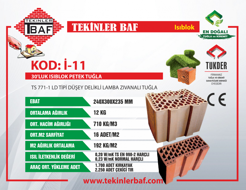TS EN 771-1 LD Tipi Düşey Delikli Lamba Zıvanalı Tuğla Ürün Kod: İ-11 • Ebatlar (Uzunluk x Genişlik x Yükseklik) : 240 mm x 300 mm x 235 mm • Ağırlık : 12 kilogram / Adet • Ortalama Hacim Ağırlığı : 710 kg/m³ • Sarfiyat : 16 adet/metrekare • Ortalama m² Ağırlık : 192 kg/m² • Isıl İletkenlik : ʎh= 0,20 W/(Mk) TS EN 998-2 Harçlı - 0,23 W/(Mk) Normal Harçlı • Araç Ortalama Yükleme Adet : 1700 Adet Kırkayak, 2250 Adet Çekici Tır