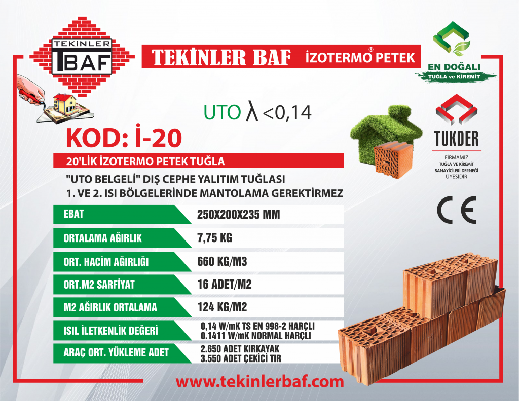 “UTO BELGELİ” DIŞ CEPHE YALITIM TUĞLASI" 1. ve 2. ISI BÖLGELERİNDE MANTOLAMA GEREKTİRMEZ Ürün Kod: İ-20 • Ebatlar (Uzunluk x Genişlik x Yükseklik) : 250 mm x 200 mm x 235 mm • Ağırlık : 7,75 kilogram • Ortalama Hacim Ağırlığı : 660 kg/m³ • Sarfiyat : 16 adet/metrekare • Ortalama m² Ağırlık : 124 kg/m² • Isıl İletkenlik : ʎh= 0,14 W/(Mk) TS EN 998-2 Harçlı - 0,1411 W/(Mk) Normal Harçlı • Araç Ortalama Yükleme Adet : 2650 Adet Kırkayak, 3550 Adet Çekici Tır