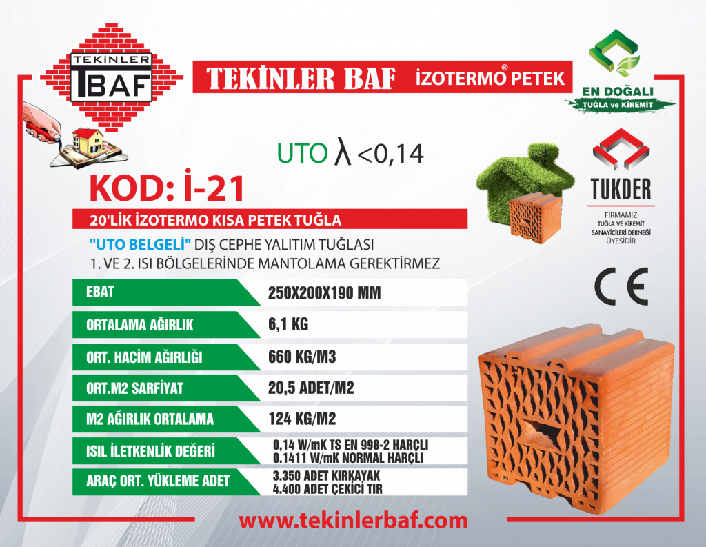 “UTO BELGELİ” DIŞ CEPHE YALITIM TUĞLASI" 1. ve 2. ISI BÖLGELERİNDE MANTOLAMA GEREKTİRMEZ Ürün Kod: İ-21 • Ebatlar (Uzunluk x Genişlik x Yükseklik) : 250 mm x 200 mm x 190 mm • Ağırlık : 6,1 kilogram • Ortalama Hacim Ağırlığı : 660 kg/m³ • Sarfiyat : 20,5 adet/metrekare • Ortalama m² Ağırlık : 124 kg/m² • Isıl İletkenlik : ʎh= 0,14 W/(Mk) TS EN 998-2 Harçlı - 0,1411 W/(Mk) Normal Harçlı • Araç Ortalama Yükleme Adet : 3350 Adet Kırkayak, 4400 Adet Çekici Tır