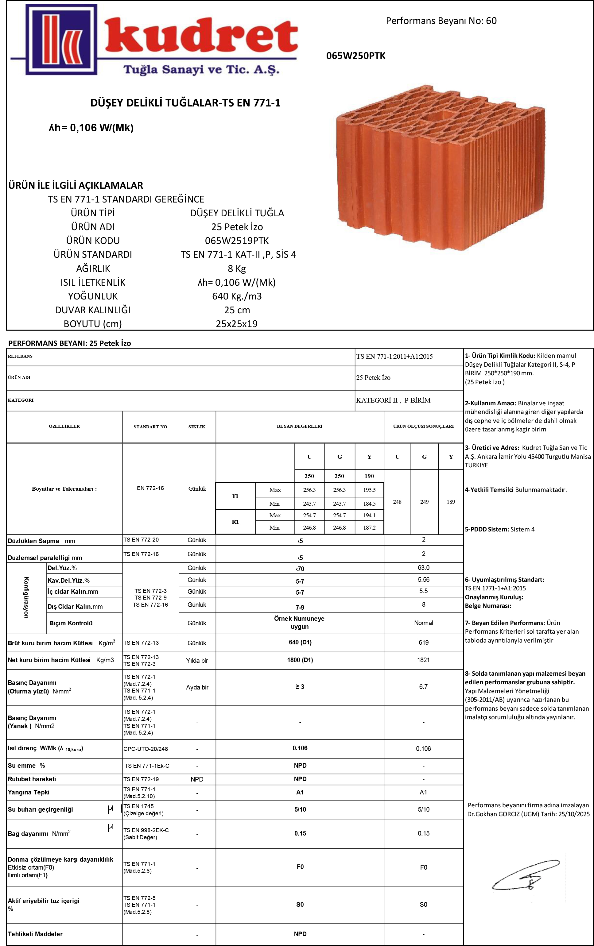 Kudret Tuğla A.Ş. den Nisan 2025 tarihi itibariyle yürürlüğe giren Yeni TS 825 Binalarda Isı Yalıtım Kuralları Standardı gereğince ülkemizin ilk 3 ısı bölgesinde duvarlarda uygulanması gereken 0,45 ve 0,40 U değerlerini ek bir yalıtım malzemesi olmadan tek başına karşılayabilen yepyeni bir inovasyon ürünü daha. İŞTE duvarda ʎh=0,106 ısı iletkenlik hesap değeri ile kullanabileceğiniz KUDRET-25’lik PETEK İZOTUĞLA