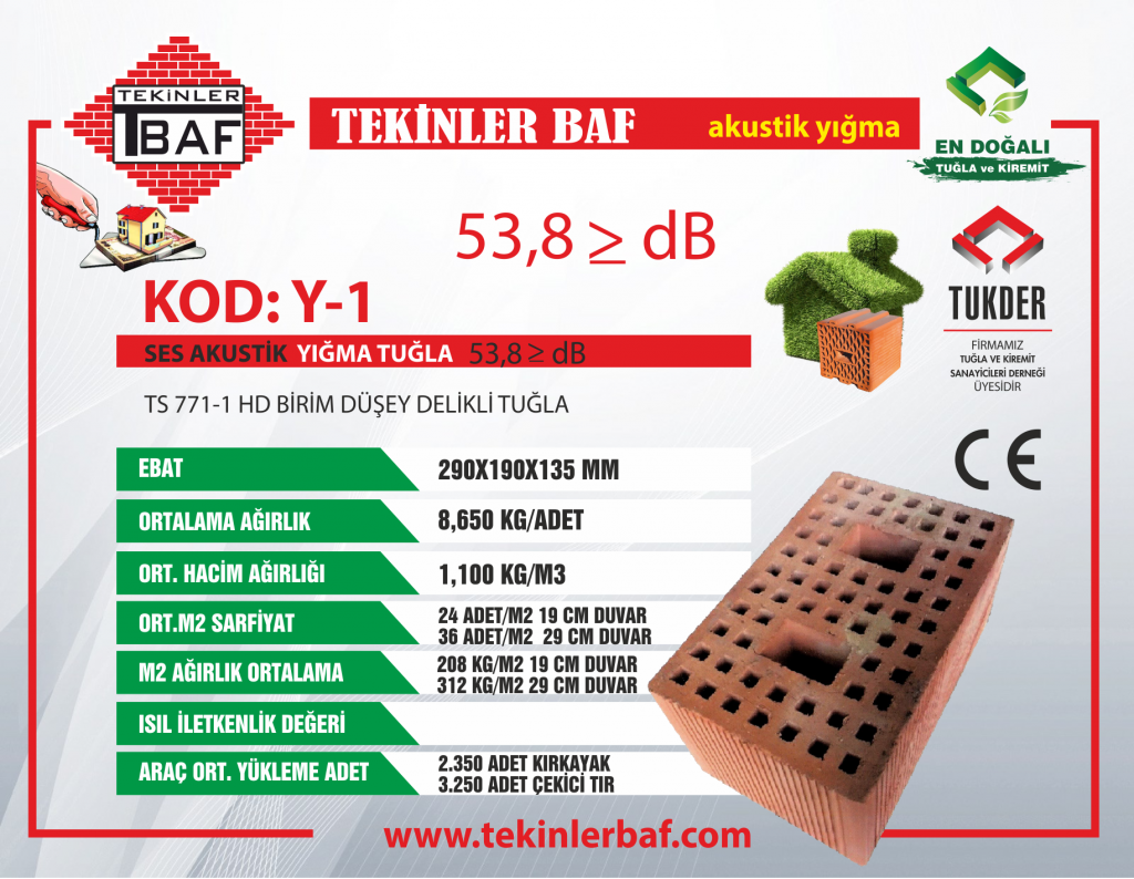 TS EN 771-1 HD Birim Düşey Delikli Tuğla Ürün Kod: Y-1 • Ebatlar (Uzunluk x Genişlik x Yükseklik) : 290 mm x 190 mm x 135 mm • Ağırlık : 8,65 kilogram / Adet • Ortalama Hacim Ağırlığı : 1100 kg/m³ • Sarfiyat : 24 adet/metrekare 19 cm Duvar İçin, 36 adet/metrekare 29 cm Duvar İçin • Ortalama m² Ağırlık : 208 kg/m² 19 cm Duvar İçin, 312 kg/m² 29 cm Duvar İçin • Ses Akustik : 53,8 >= dB • Araç Ortalama Yükleme Adet : 2350 Adet Kırkayak, 3250 Adet Çekici Tır