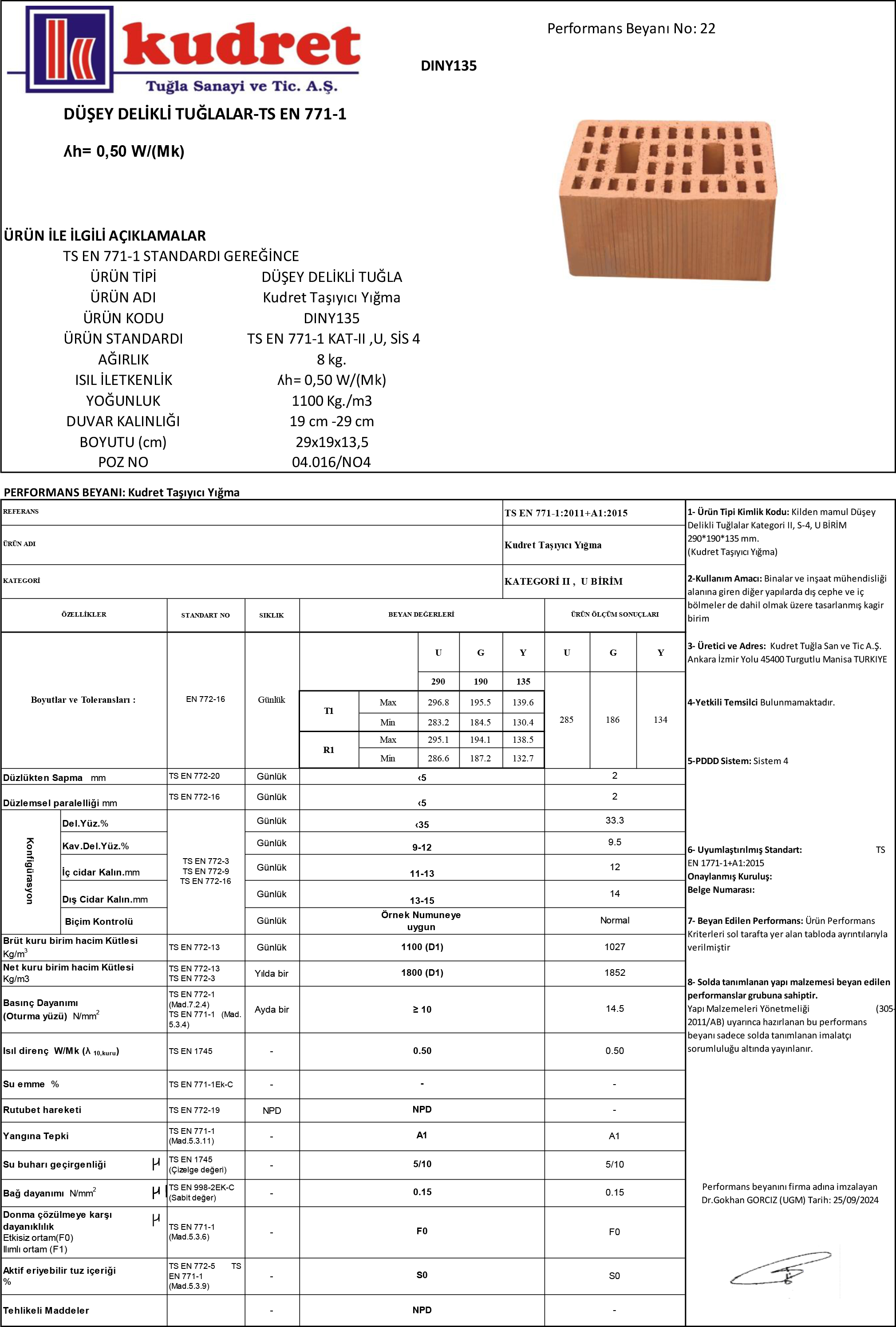 • Ürün Tipi : Düşey Delikli Tuğla • Ürün Adı : Kudret Taşıyıcı Yığma • Ürün Kodu : DINY135 • Ürün Standardı : TS EN 771-1 KAT-II ,P, SİS 4 • Ağırlık : 8 Kg • Isı İletkenlik : ʎh= 0,50 W/(Mk) • Yoğunluk : 1100 Kg/m3 • Duvar Kalınlığı : 19 cm -29 cm • Boyutu (cm) : 29x19x13,5