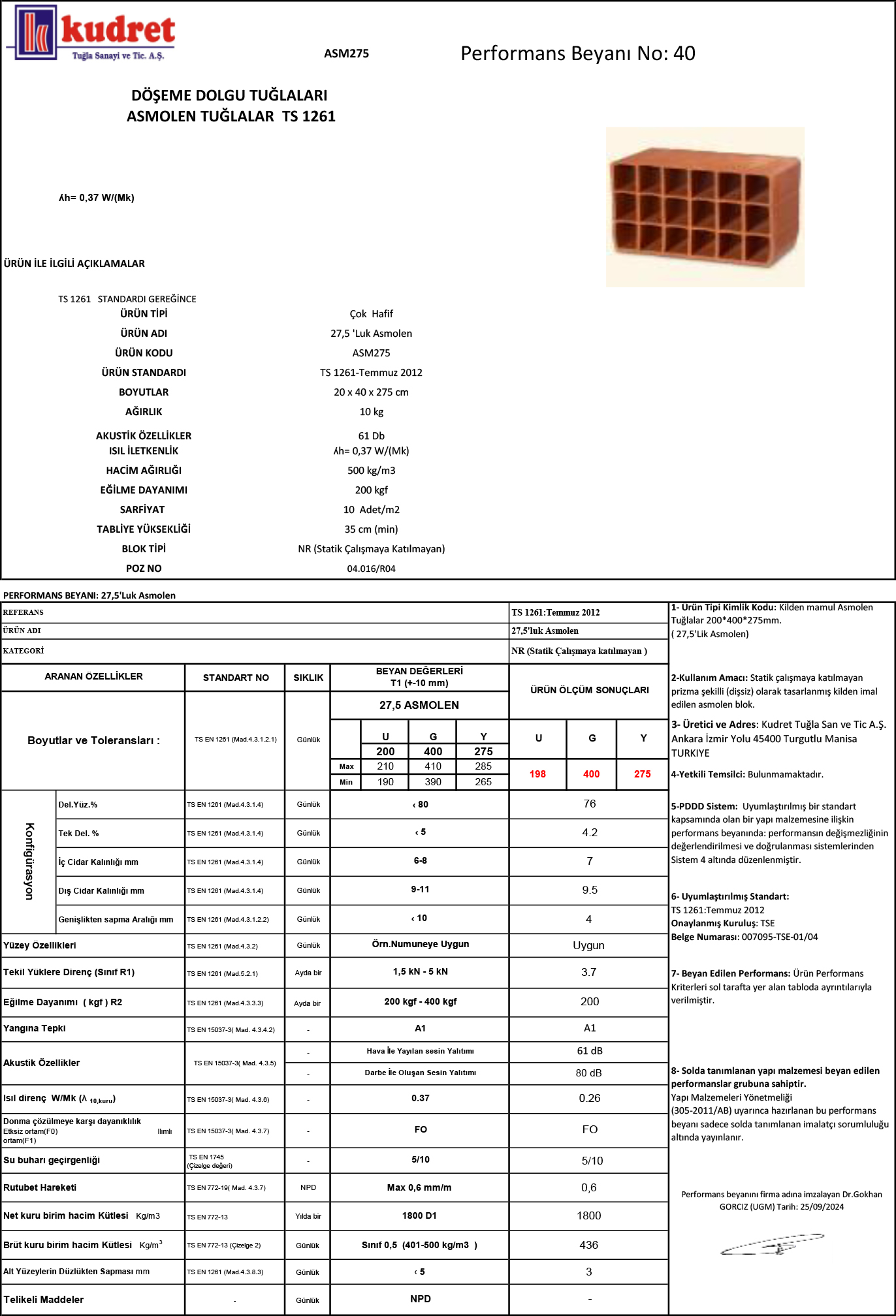 Asmolen Tuğla Grubu Kudret Tuğla - 27,5'luk Asmolen Dolgu Tuğlası - 200 x 400 x 275 mm Ebatlarında Asmolen Döşeme Tuğlası Asmolen Tuğlaları