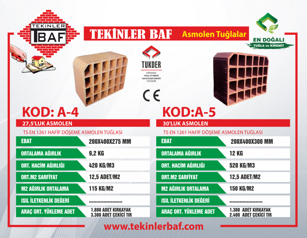 TS EN 1261 HAFİF DÖŞEME ASMOLEN TUĞLASI Ürün Kod: A-4 • Ebatlar (Yükseklik x Uzunluk x Genişlik) : 275 mm x 200 mm x 400 mm • Ağırlık : 9,2 kilogram • Ortalama Hacim Ağırlığı : 420 kg/m³ • Sarfiyat : 12,5 adet/metrekare • Ortalama m² Ağırlık : 115 kg/m² • Araç Ortalama Yükleme Adet : 1800 Adet Kırkayak, 3300 Adet Çekici Tır