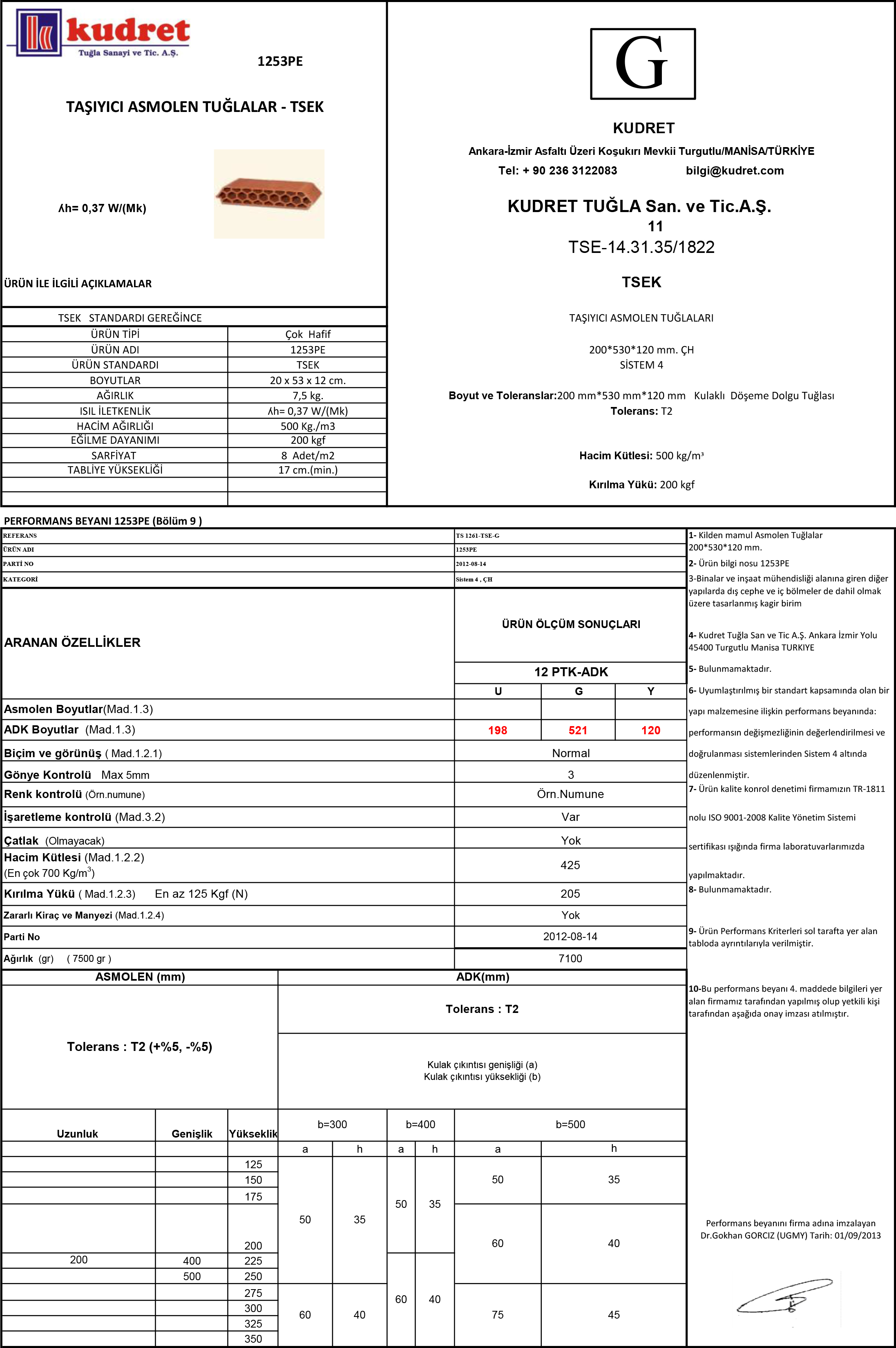 • Ürün Tipi : Çok Hafif Asmolen Döşeme Kulaklı Dolgu Tuğlaları • Ürün Adı : 12 Petek ADK • Ürün Kodu : 1253PE • Ürün Standardı : TSE-14.31.35/1822 • Boyutu (cm) : 20 x 53 x 12 cm • Ağırlık : 7,5 kg • Isı İletkenlik : ʎh= 0,37 W/(Mk) • Hacim Ağırlığı : 500 kg/m3 • Eğilme Dayanımı : 250 kgf • Sarfiyat Adet/m2 : 8 Adet/m2 • Tabliye Yüksekliği : 17 cm (min)