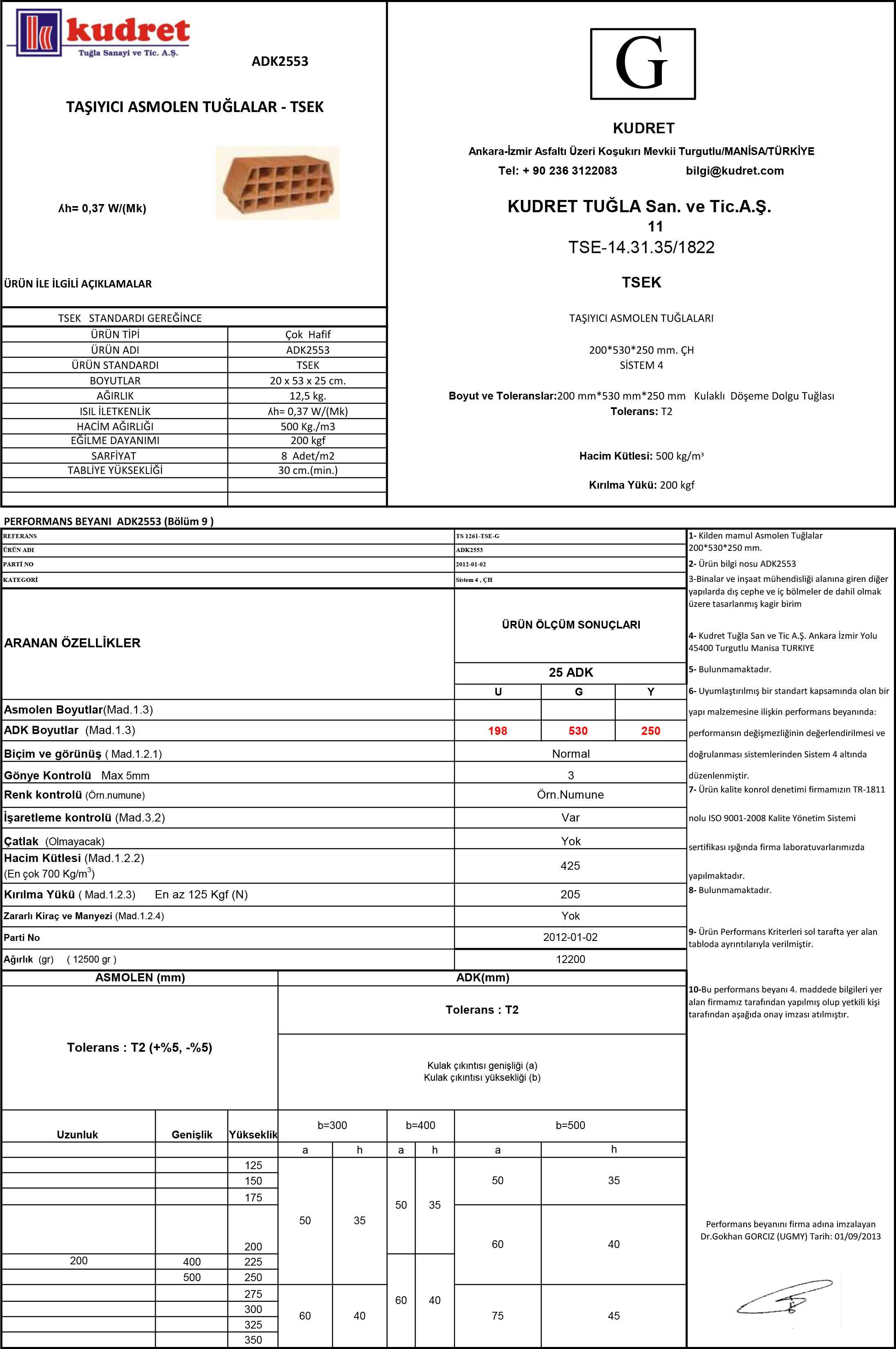 • Ürün Tipi : Çok Hafif Asmolen Döşeme Kulaklı Dolgu Tuğlaları • Ürün Adı : 25 ADK • Ürün Kodu : ADK2553 • Ürün Standardı : TSE-14.31.35/1822 • Boyutu (cm) : 20 x 53 x 25 cm • Ağırlık : 12,5 kg • Isı İletkenlik : ʎh= 0,37 W/(Mk) • Hacim Ağırlığı : 500 kg/m3 • Eğilme Dayanımı : 200 kgf • Sarfiyat Adet/m2 : 8 Adet/m2 • Tabliye Yüksekliği : 30 cm (min)