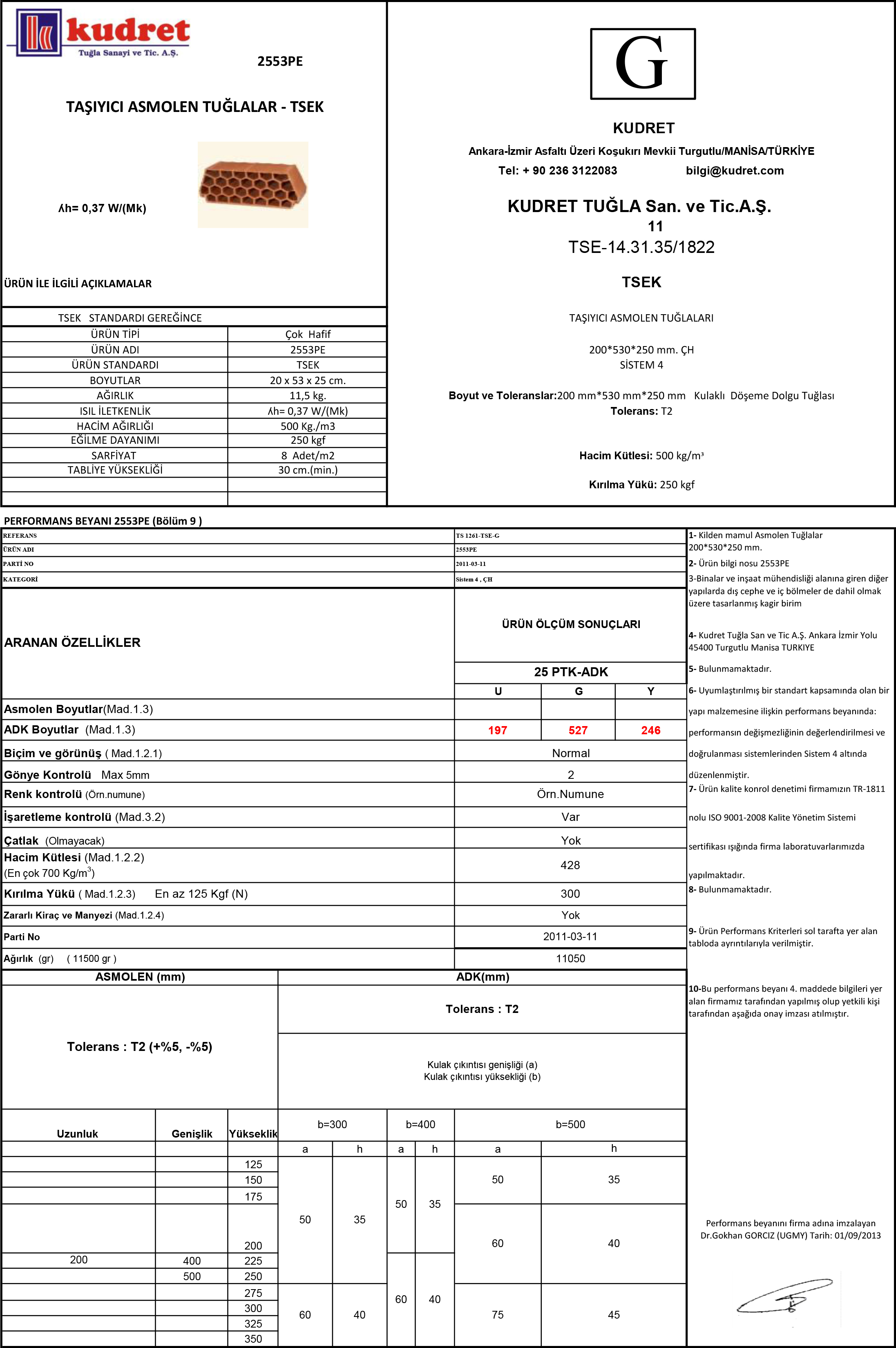 • Ürün Tipi : Çok Hafif Asmolen Döşeme Kulaklı Dolgu Tuğlaları • Ürün Adı : 25 Petek ADK • Ürün Kodu : ASM 325 • Ürün Standardı : TSE-14.31.35/1822 • Boyutu (cm) : 20 x 53 x 25 cm • Ağırlık : 11,5 kg • Isı İletkenlik : ʎh= 0,37 W/(Mk) • Hacim Ağırlığı : 500 kg/m3 • Eğilme Dayanımı : 250 kgf • Sarfiyat Adet/m2 : 8 Adet/m2 • Tabliye Yüksekliği : 30 cm (min)