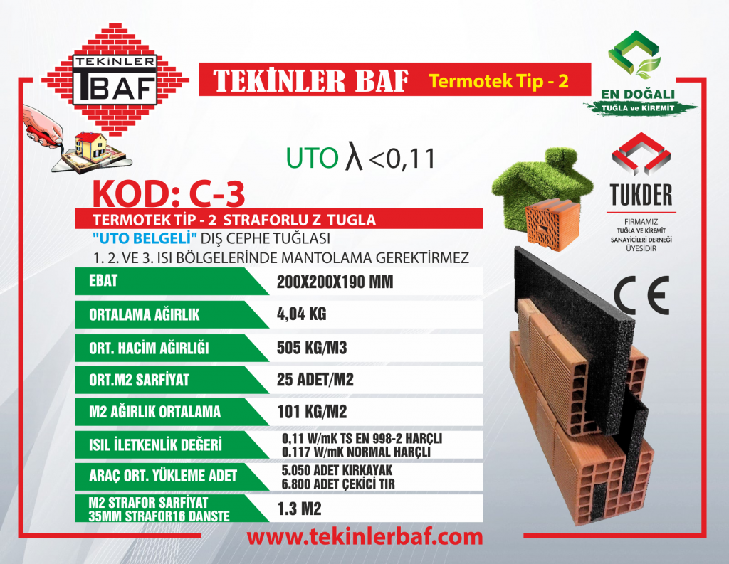 “UTO BELGELİ” DIŞ CEPHE TUĞLASI" 1. 2. ve 3. ISI BÖLGELERİNDE MANTOLAMA GEREKTİRMEZ Ürün Kod: C-3 • Ebatlar (Uzunluk x Genişlik x Yükseklik) : 200 mm x 200 mm x 190 mm • Ağırlık : 4,04 kilogram • Ortalama Hacim Ağırlığı : 505 kg/m³ • Sarfiyat : 25 adet/metrekare • Ortalama m² Ağırlık : 101 kg/m² • Isıl İletkenlik : ʎh= 0,11 W/(Mk) TS EN 998-2 Harçlı - 0,117 W/(Mk) Normal Harçlı • Araç Ortalama Yükleme Adet : 5050 Adet Kırkayak, 6800 Adet Çekici Tır • Metrekarede Ortalama Strafor Sarfiyatı (35mm Strafor 16 Danste) : 1,3 m²