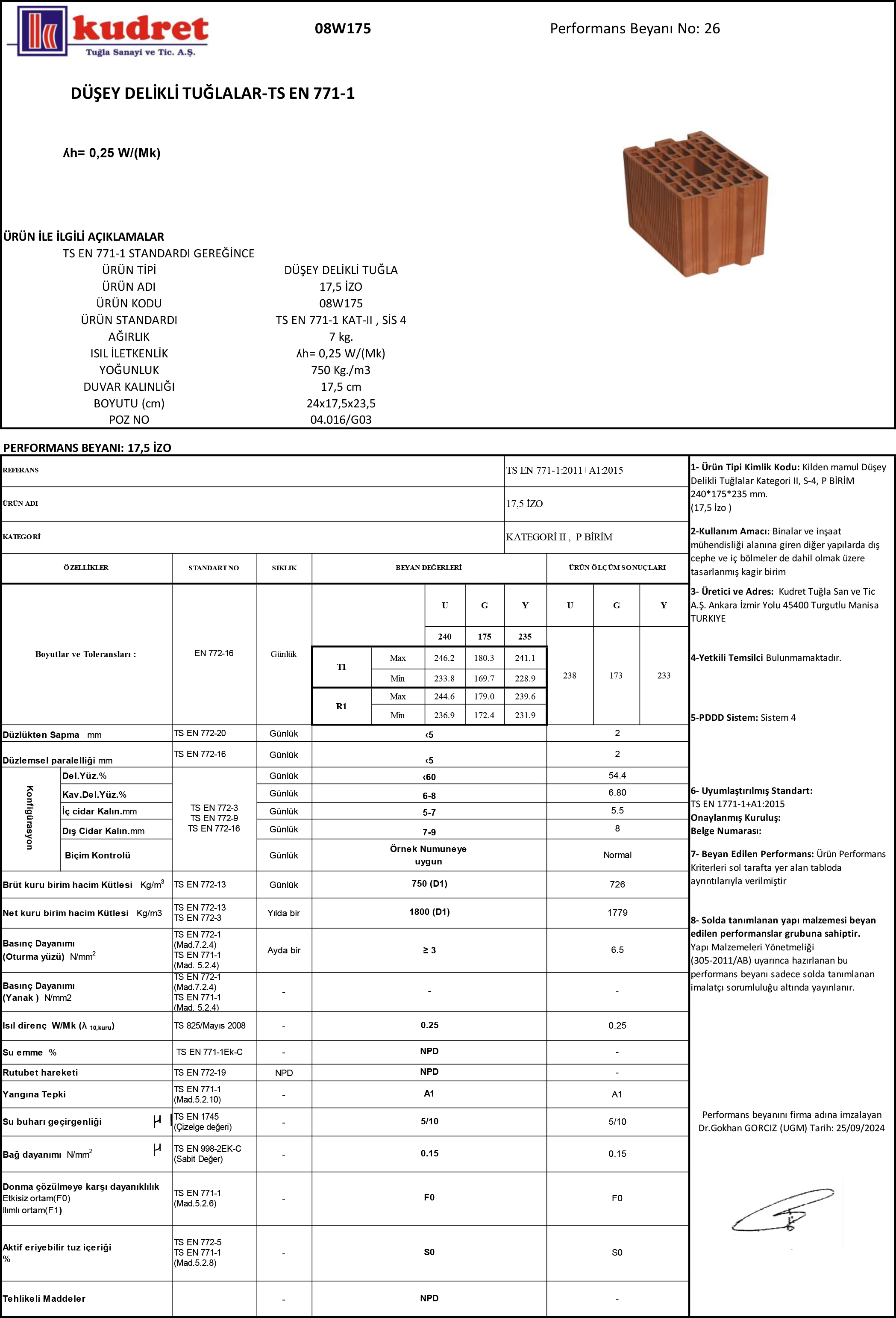 • Ürün Tipi : Düşey Delikli Tuğla • Ürün Adı : 17,5 İZO • Ürün Kodu : 08W175 • Ürün Standardı : TS EN 771-1 KAT-II ,P, SİS 4 • Ağırlık : 7 Kg • Isı İletkenlik : ʎh= 0,25 W/(Mk) • Yoğunluk : 750 Kg/m3 • Duvar Kalınlığı : 17,5 cm • Boyutu (cm) : 24x17,5x23,5