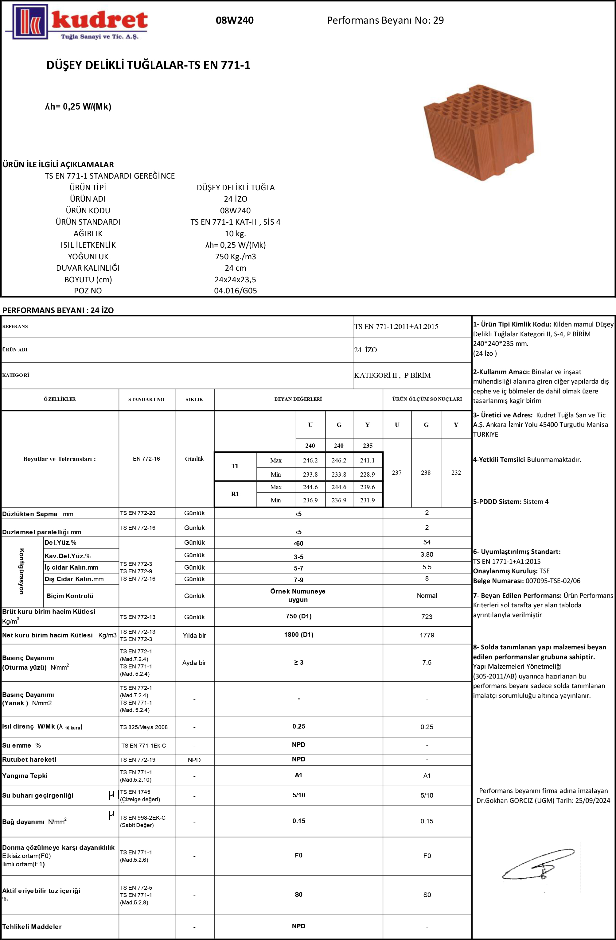 • Ürün Tipi : Düşey Delikli Tuğla • Ürün Adı : 24 İZO • Ürün Kodu : 08W240 • Ürün Standardı : TS EN 771-1 KAT-II ,P, SİS 4 • Ağırlık : 10 Kg • Isı İletkenlik : ʎh= 0,25 W/(Mk) • Yoğunluk : 750 Kg/m3 • Duvar Kalınlığı : 24 cm • Boyutu (cm) : 24x24x23,5