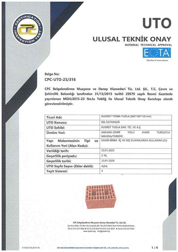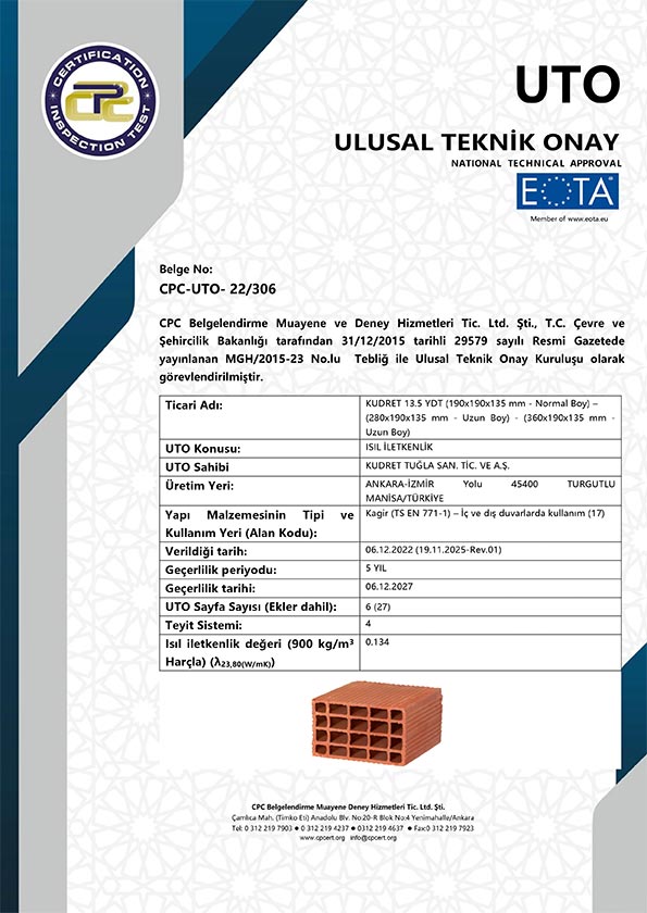 Kudret 25 Termal Tuğla, birlikte verilen TSE belgeli 16–18 DNS yüksek kaliteli karbon EPS paneller ile 1., 2., 3. ve 4. ısı bölgelerinde yeterli yalıtımı sağlamaktadır. Ürünümüz UTO belgelidir.