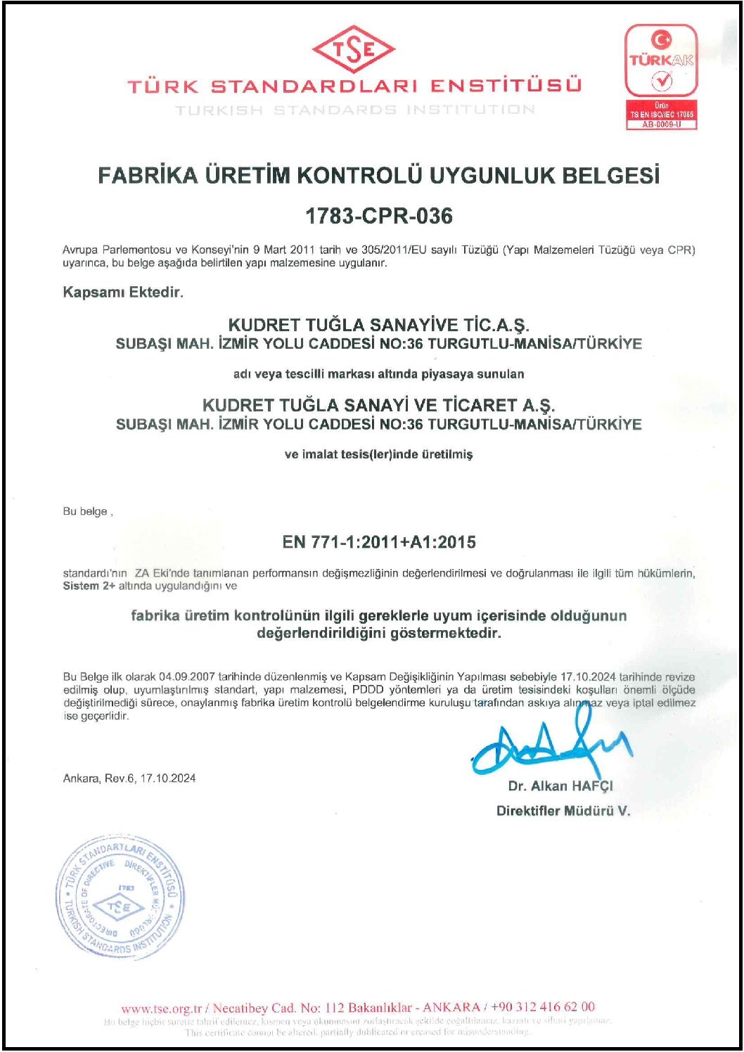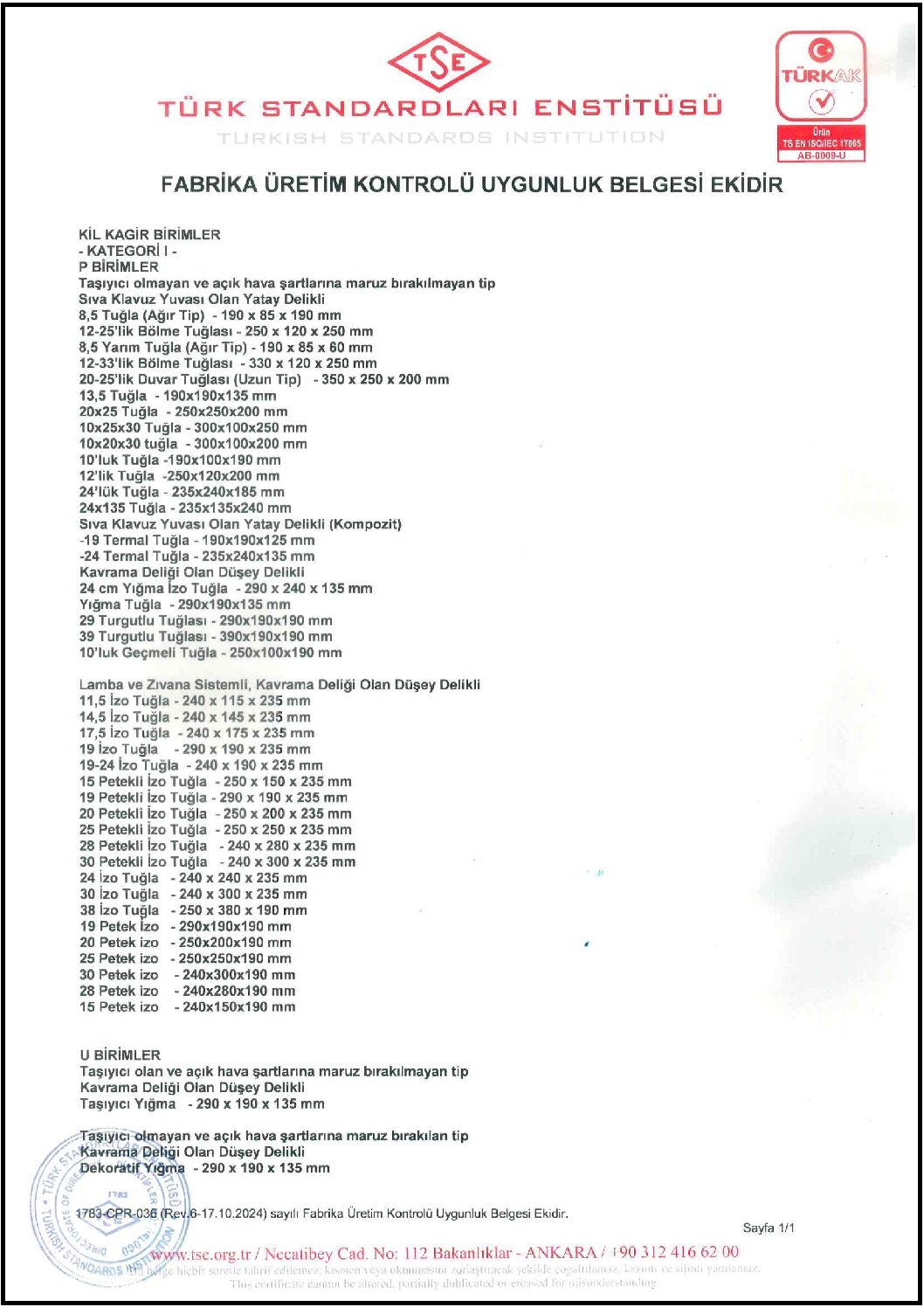 tuğlaları, TS EN 771-1 standardına göre CE markalı olarak üretilmektedir.