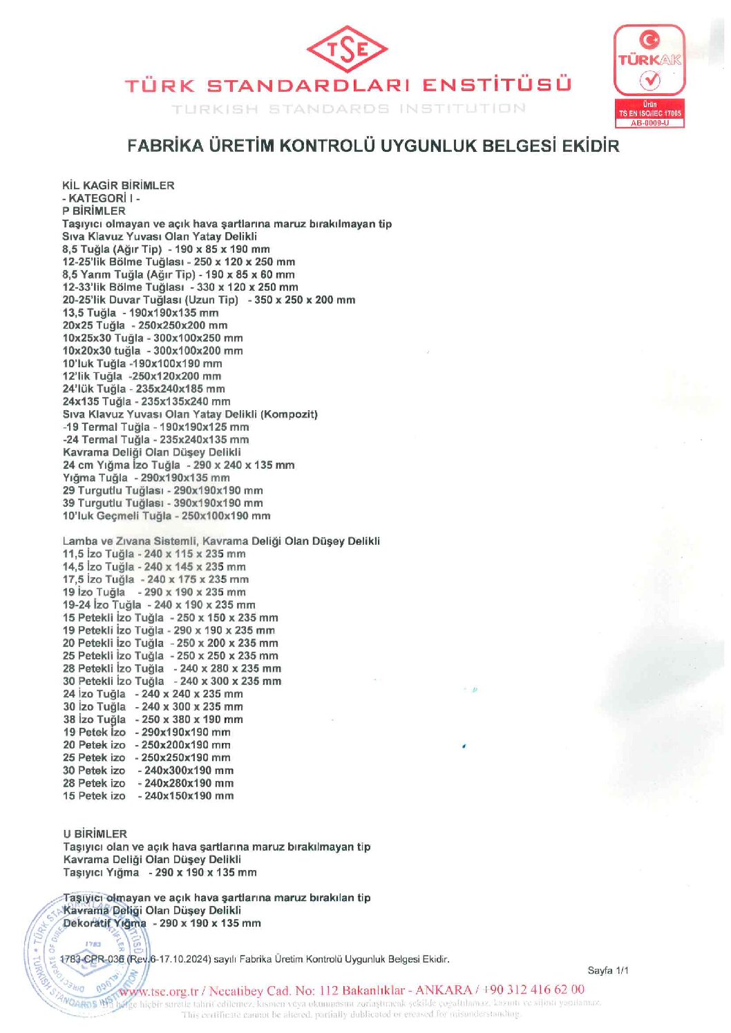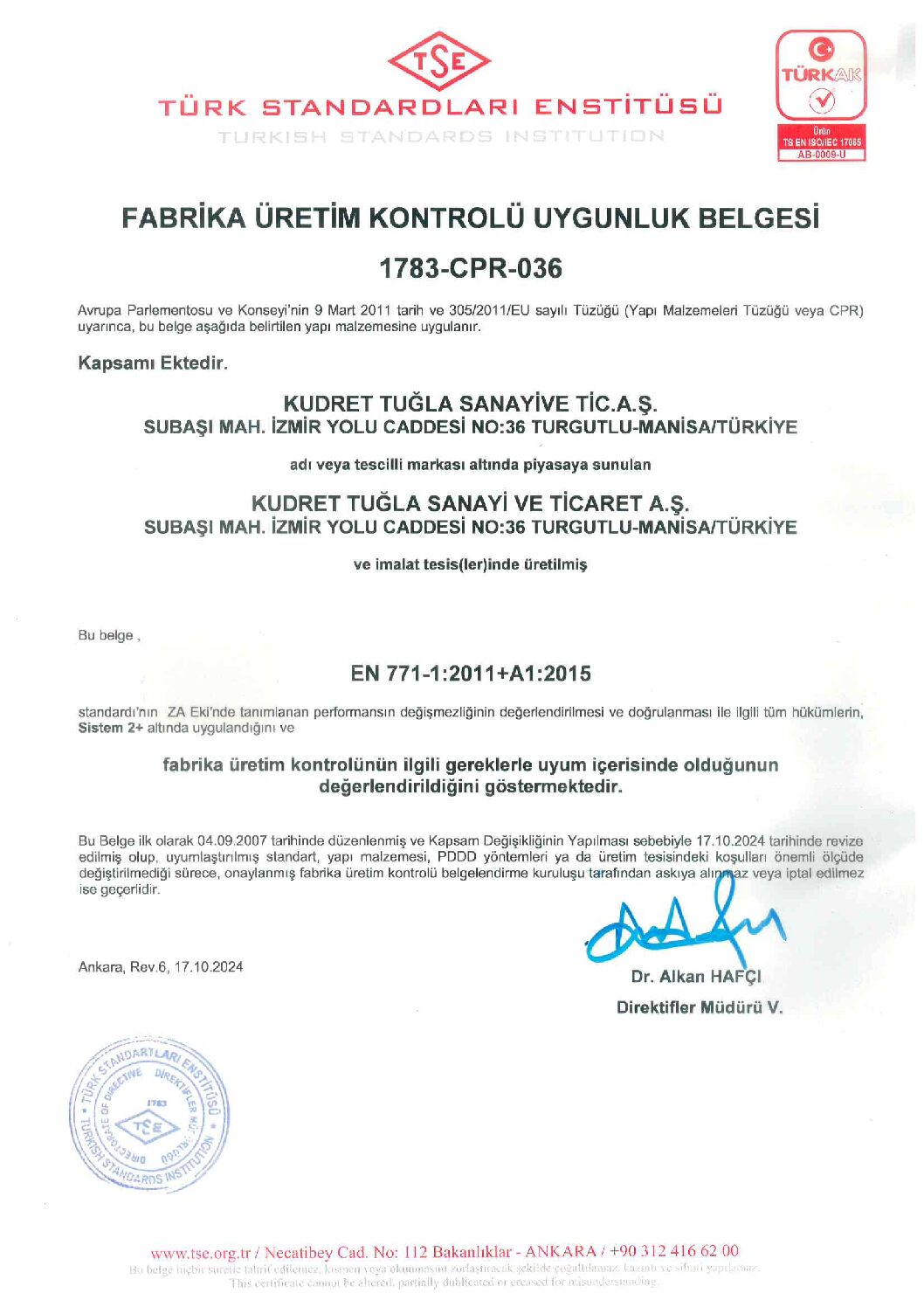 Kudret Tuğla AŞ üretimi tuğlalar, Türk Standartları Enstitüsü’nce onaylanmış laboratuarlarda kontrol edilmekte ve ürünlerin tamamı ISO 9001 Kalite Güvence Sistemi Standartları çerçevesinde yüksek kalite standartlarında üretilmektedir. Üretimlerimizin kalite düzeyleri, TSE den alınan CE sertifikası ile onaylanmıştır.