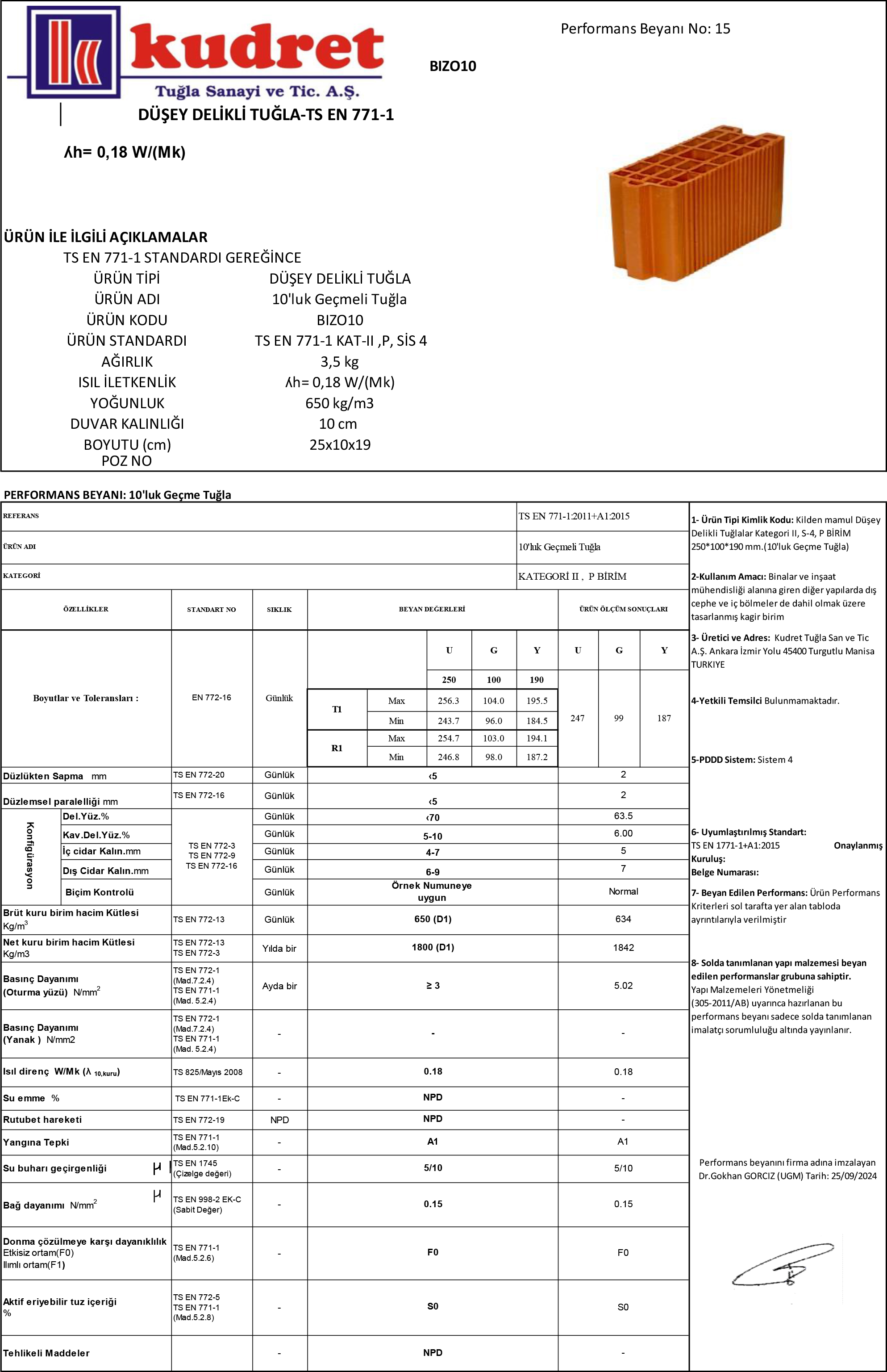 • Ürün Tipi : Düşey Delikli Tuğla • Ürün Adı : 10'luk Geçmeli Tuğla • Ürün Kodu : BIZO10 • Ürün Standardı : TS EN 771-1 KAT-II ,P, SİS 4 • Ağırlık : 3,5 Kg • Isı İletkenlik : ʎh= 0,18 W/(Mk) • Yoğunluk : 650 Kg/m3 • Duvar Kalınlığı : 10 cm • Boyutu (cm) : 25x10x19