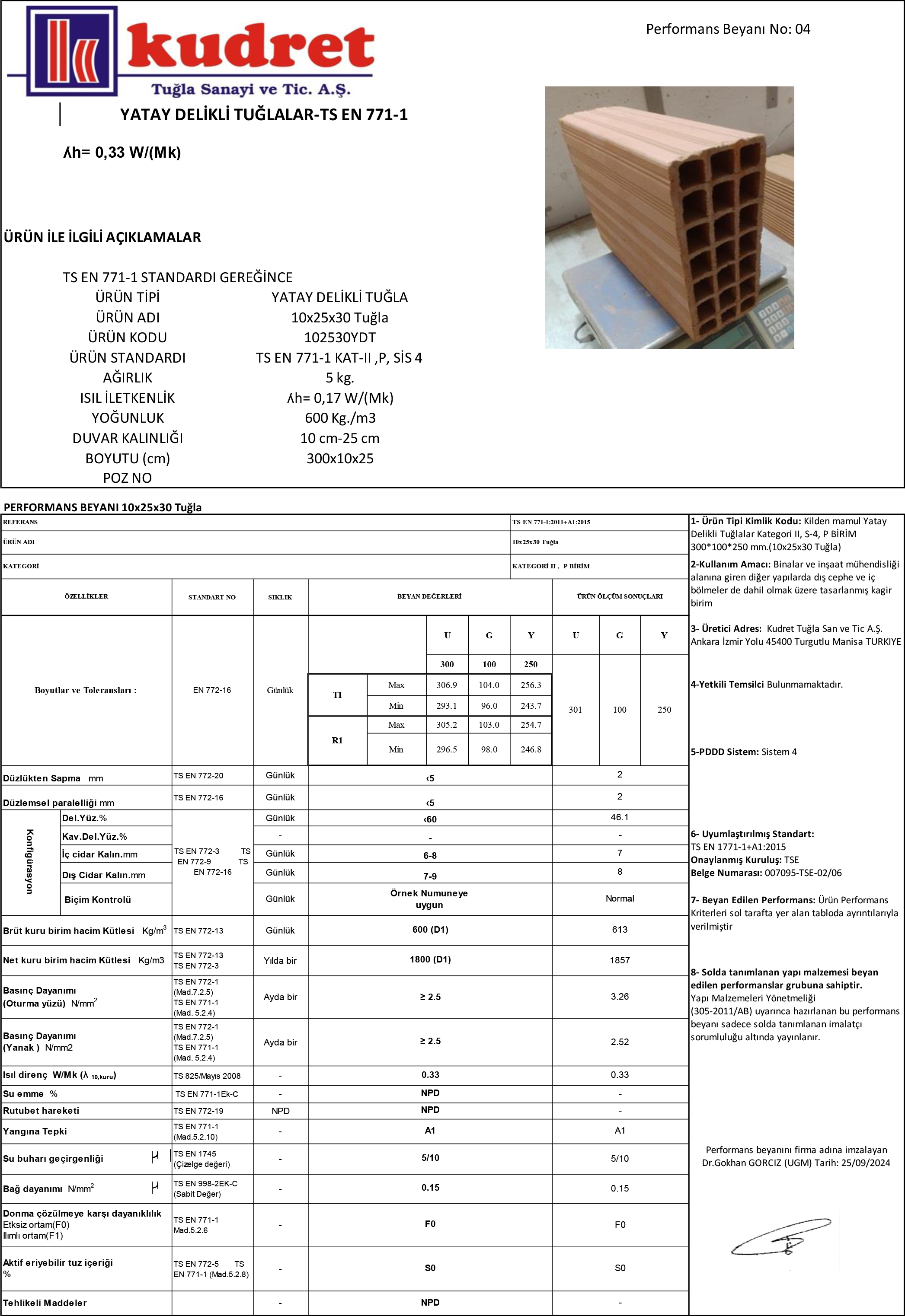 • Ürün Tipi : Yatay Delikli Tuğla • Ürün Adı : 10x25x30 Tuğla • Ürün Kodu : 102530YDT • Ürün Standardı : TS EN 771-1 KAT-II ,P, SİS 4 • Ağırlık : 5 Kg • Isı İletkenlik : ʎh= 0,17 W/(Mk) • Yoğunluk : 600 Kg/m3 • Duvar Kalınlığı : 10 cm-25 cm • Boyutu (cm) : 30x10x25