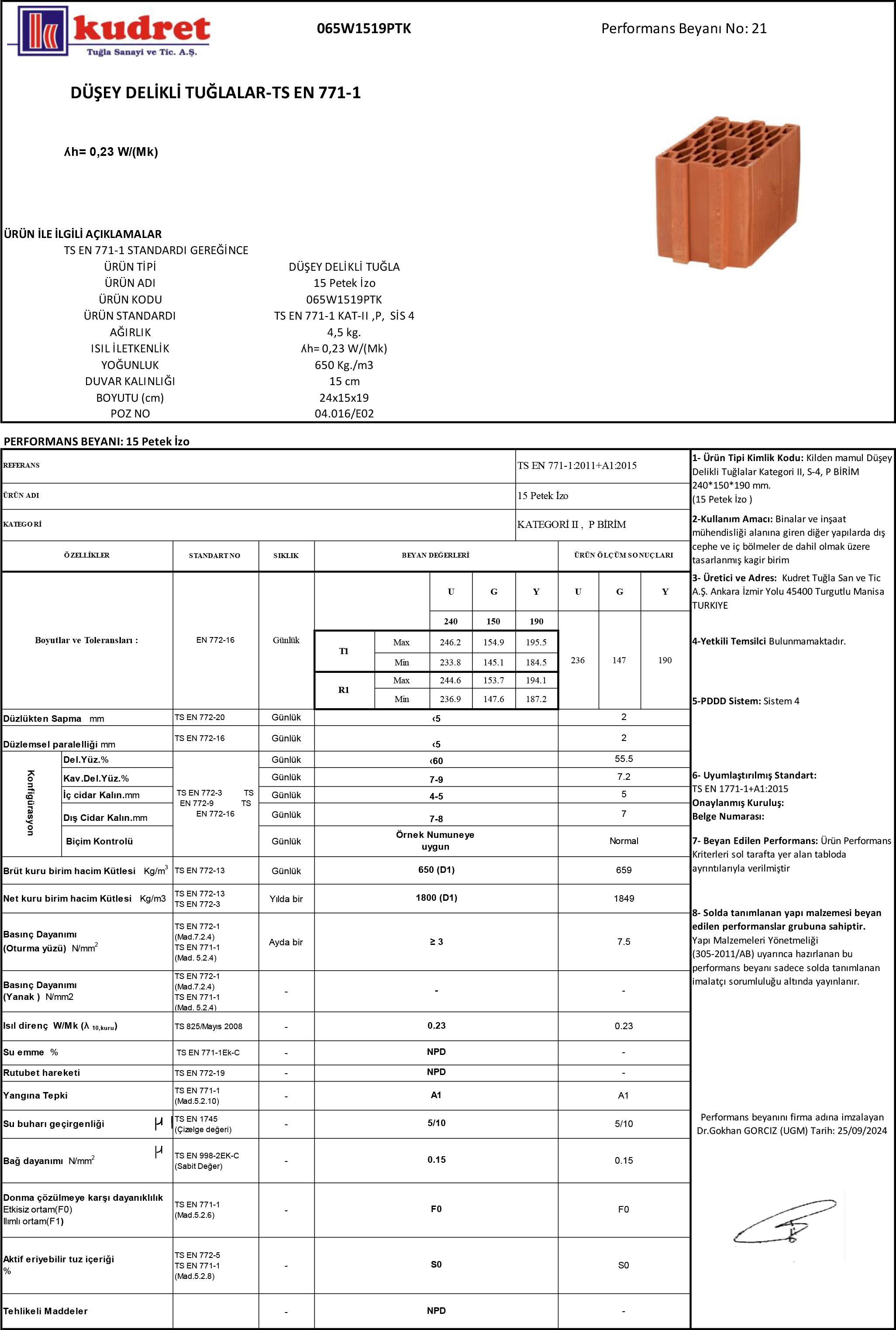 • Ürün Tipi : Düşey Delikli Tuğla • Ürün Adı : 15 Petek İzo • Ürün Kodu : 065W1519PTK • Ürün Standardı : TS EN 771-1 KAT-II ,P, SİS 4 • Ağırlık : 4,5 Kg • Isı İletkenlik : ʎh= 0,23 W/(Mk) • Yoğunluk : 650 Kg/m3 • Duvar Kalınlığı : 15 cm • Boyutu (cm) : 24x15x19