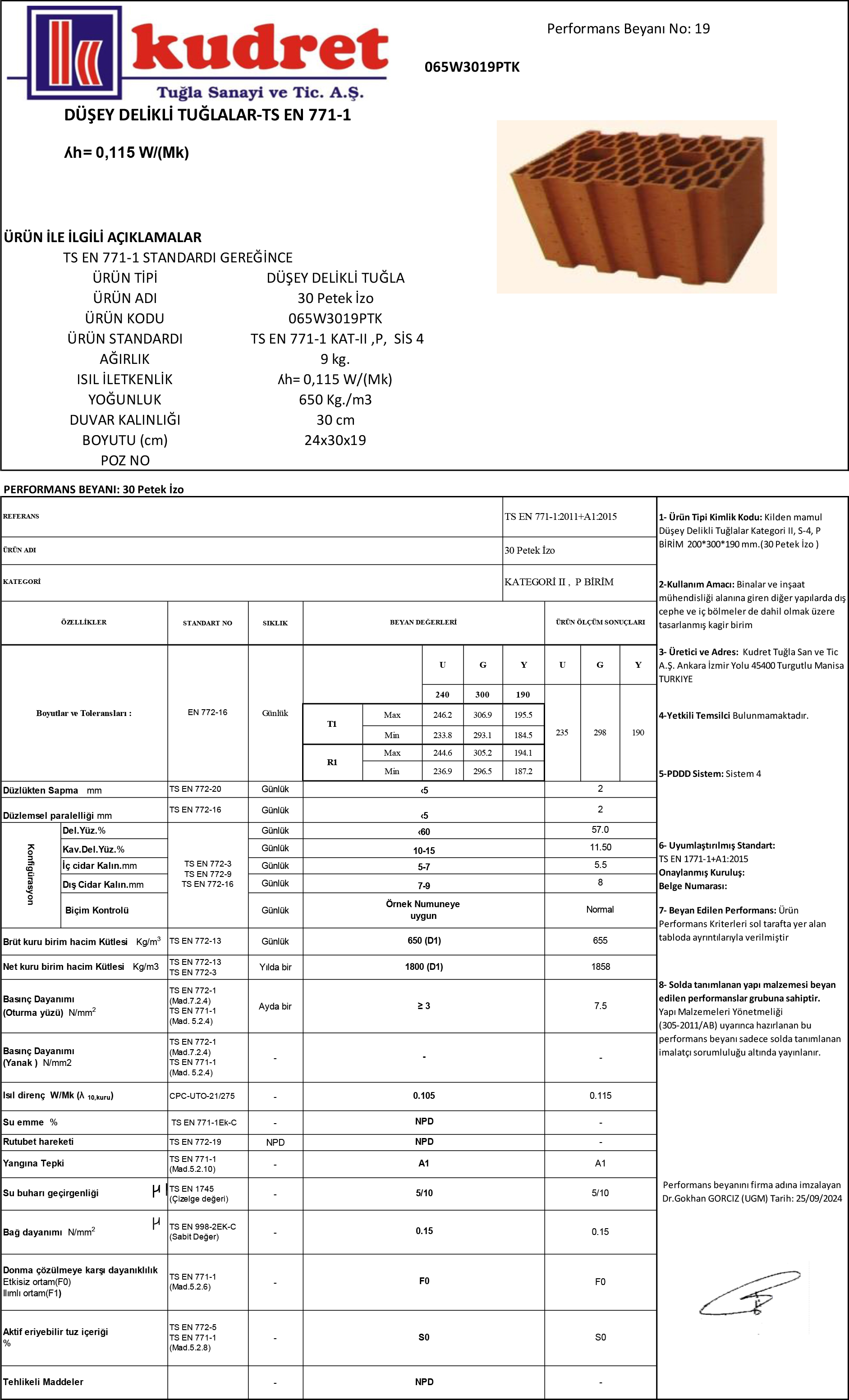 • Ürün Tipi : Düşey Delikli Tuğla • Ürün Adı : 30 Petek İzo • Ürün Kodu : 065W3019PTK • Ürün Standardı : TS EN 771-1 KAT-II ,P, SİS 4 • Ağırlık : 9 Kg • Isı İletkenlik : ʎh= 0,115 W/(Mk) • Yoğunluk : 650 Kg/m3 • Duvar Kalınlığı : 30 cm • Boyutu (cm) : 24x30x19