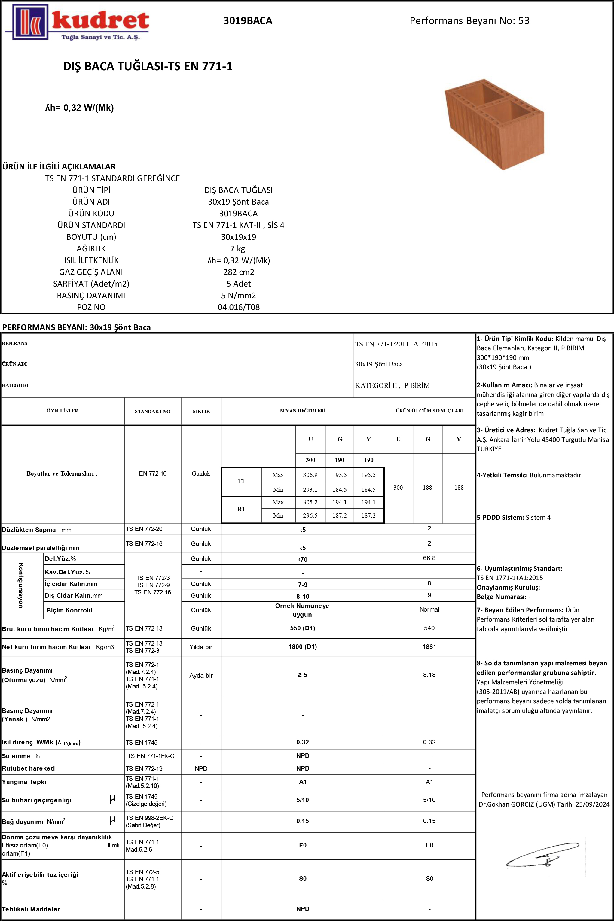 • Ürün Tipi : Dış Baca Tuğlası • Ürün Adı : 230x19 Şönt Baca • Ürün Kodu : 3019BACA • Ürün Standardı : TS EN 771-1 KAT-II, SİS 4 • Boyutu (cm) : 30x19x19 • Ağırlık : 7 kg • Isı İletkenlik : ʎh= 0,32 W/(Mk) • Gaz Geçiş Alanı : 282 cm2 • Sarfiyat Adet/m2 : 5 Adet • Basınç Dayanımı : 5 N/mm2