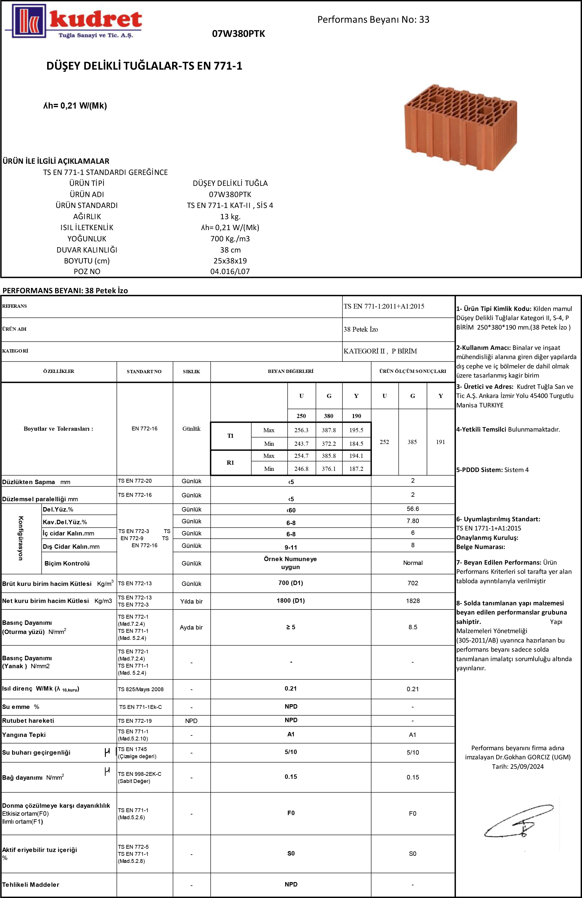 • Ürün Tipi : Düşey Delikli Tuğla • Ürün Adı : 38 Petek İzo • Ürün Kodu : 07W380PTK • Ürün Standardı : TS EN 771-1 KAT-II ,P, SİS 4 • Ağırlık : 13 Kg • Isı İletkenlik : ʎh= 0,21 W/(Mk) • Yoğunluk : 700 Kg/m3 • Duvar Kalınlığı : 38 cm • Boyutu (cm) : 25x38x19