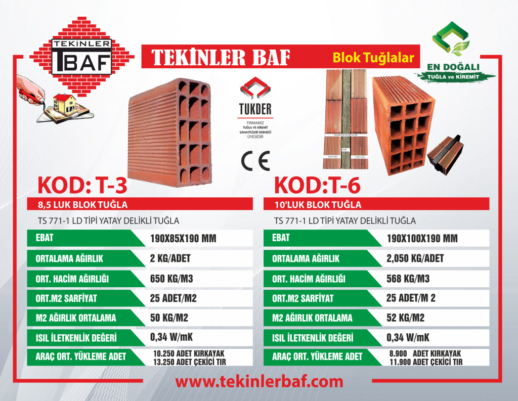 TS EN 771-1 LD Tipi Yatay Delikli Tuğla Ürün Kod: T-6 • Ebatlar (Uzunluk x Genişlik x Yükseklik) : 190 mm x 100 mm x 190 mm • Ağırlık : 2,05 kilogram / Adet • Ortalama Hacim Ağırlığı : 568 kg/m³ • Sarfiyat : 25 adet/metrekare • Ortalama m² Ağırlık : 52 kg/m² • Isıl İletkenlik : ʎh= 0,34 W/(Mk) • Araç Ortalama Yükleme Adet : 8900 Adet Kırkayak, 11900 Adet Çekici Tır