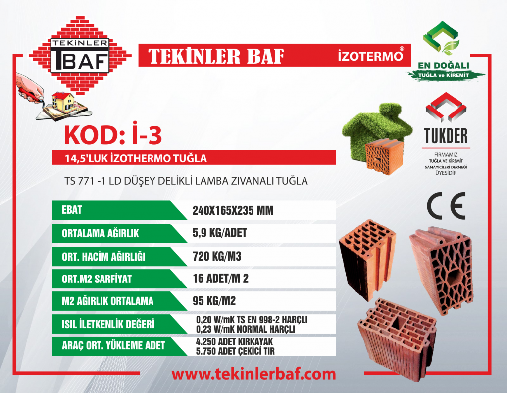 TS EN 771-1 LD Tipi Düşey Delikli Lamba Zıvanalı Tuğla Ürün Kod: İ-3 • Ebatlar (Uzunluk x Genişlik x Yükseklik) : 240 mm x 165 mm x 235 mm • Ağırlık : 5,9 kilogram / Adet • Ortalama Hacim Ağırlığı : 720 kg/m³ • Sarfiyat : 16 adet/metrekare • Ortalama m² Ağırlık : 95 kg/m² • Isıl İletkenlik : ʎh= 0,20 W/(Mk) TS EN 998-2 Harçlı - 0,23 W/(Mk) Normal Harçlı • Araç Ortalama Yükleme Adet : 4250 Adet Kırkayak, 5750 Adet Çekici Tır